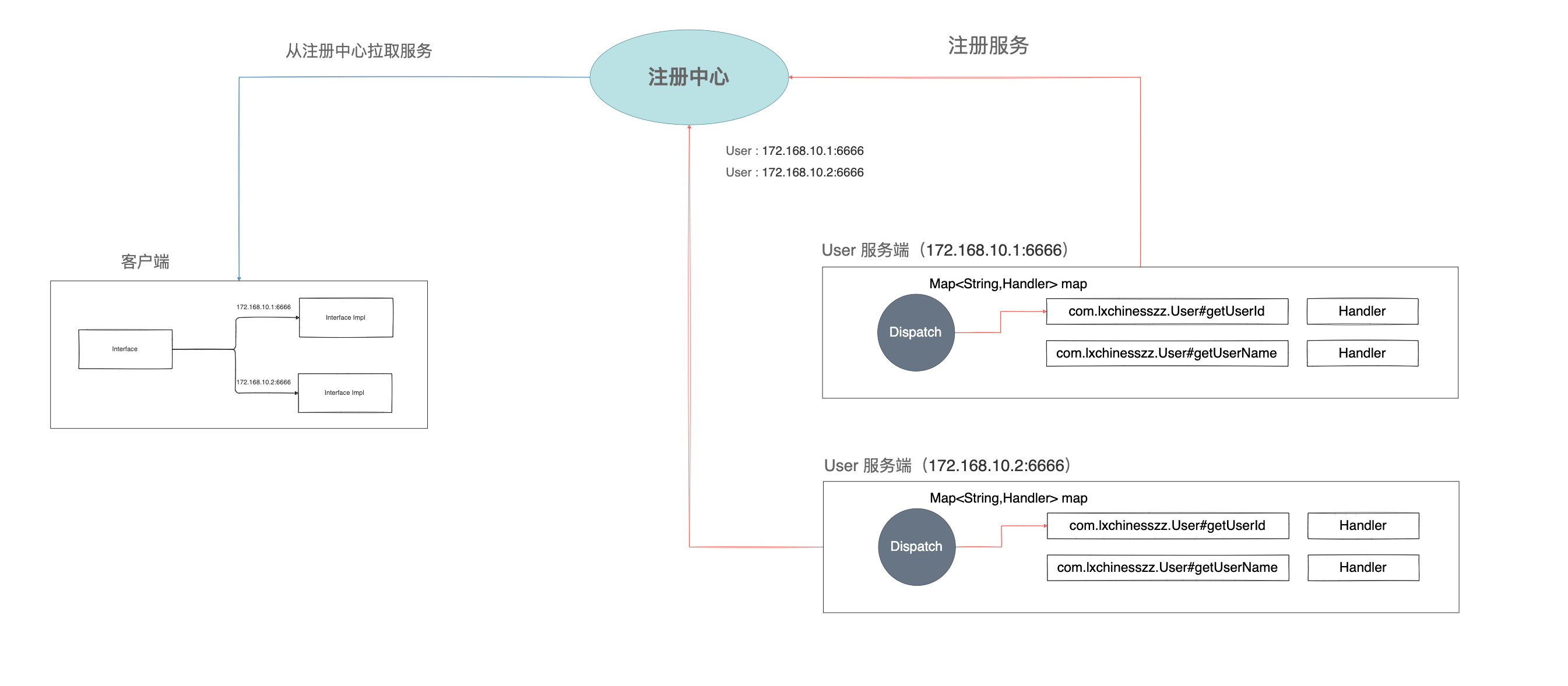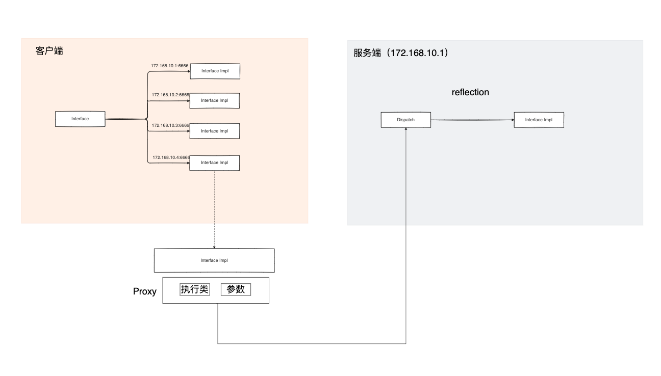 左边客户端的接口,通过代理的方式,将客户端的参数通过网络管道传输给某台服务端的本地进行执行。执行后获取结果,返回给客户端的调用方。而这些都是通过代理的方式实现的,所以开发者就好像调用本地方法一样。实现一次远程方法的调用。