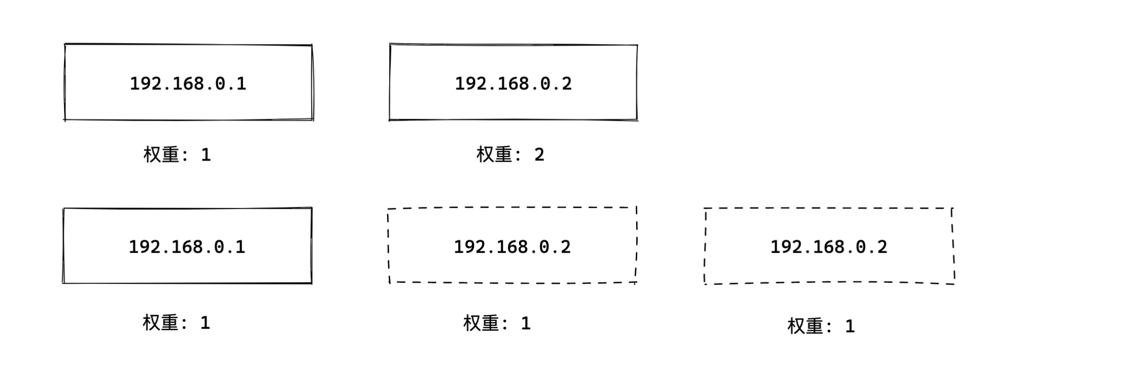 一个简单暴力的加权算法,如下图。按照权重,重新构建集合。然后再将集合进行取模轮训即可。即可实现一个最简单 的加权算法。