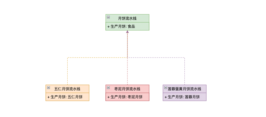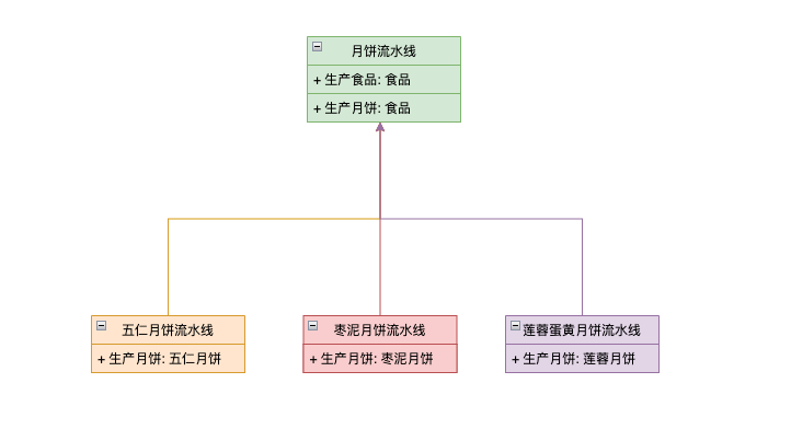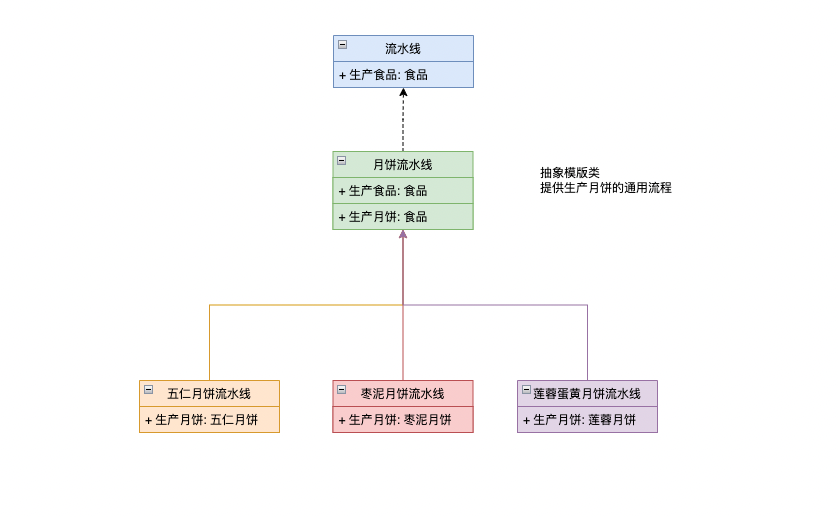 每个食品车间,生产的食品,味道可能也是不同的,食品加工工艺也是不同的。为每个食品车间定义一个流水线接口, 相同食品一定会有通用的操作流程,所以定义一个标准的月饼生产模版类,模版类中提供通用的流程。
