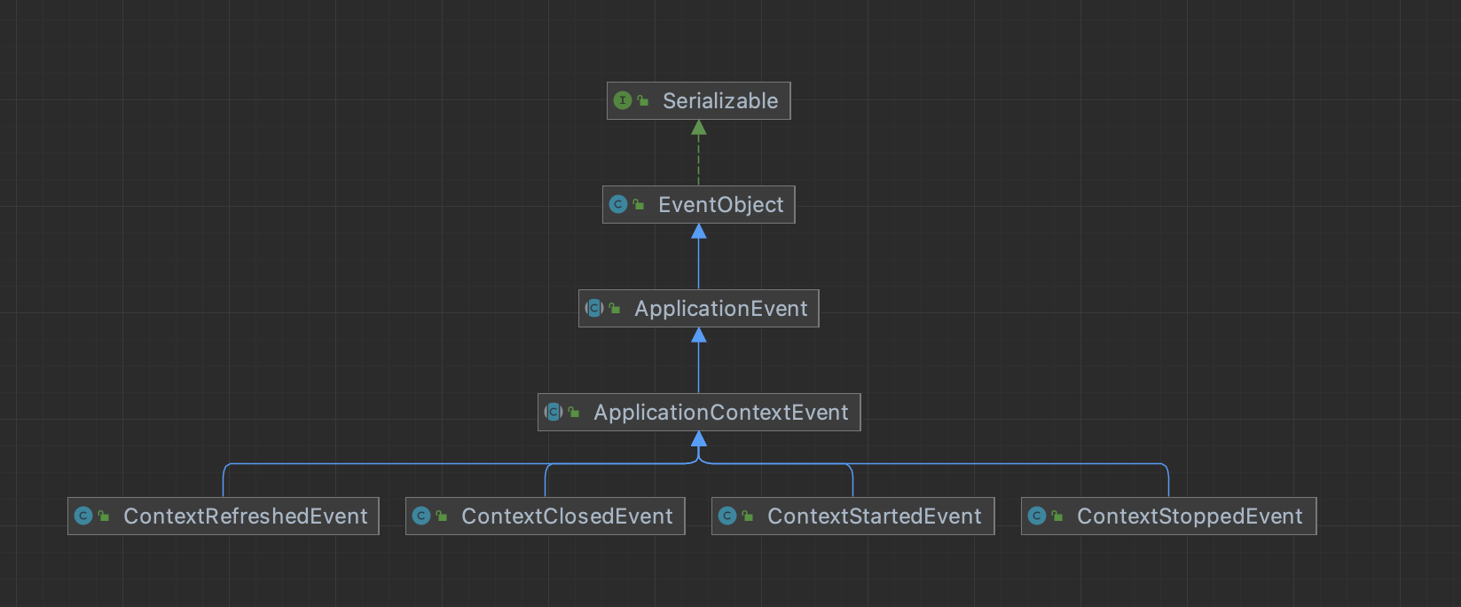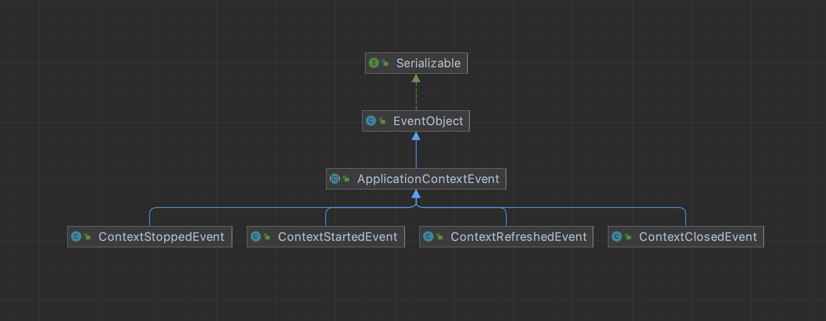 - ApplicationContextEvent 继承了ApplicationEvent,事件对象是容器上下文。
