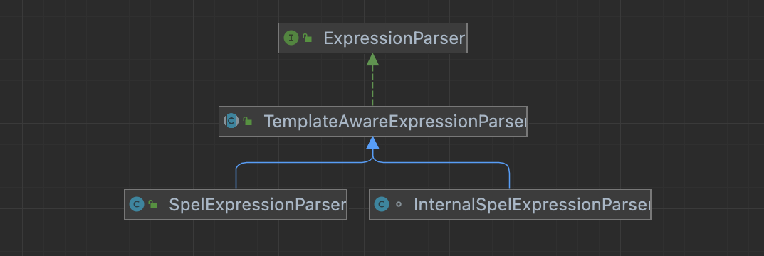 解析器上下文接口,主要是对解析器Token的抽象类,包含3个方法:getExpressionPrefix,getExpressionSuffix和isTemplate,就是表示表达式从什么符号开始什么符号结束,是否是作为模板(包含字面量和表达式)解析。