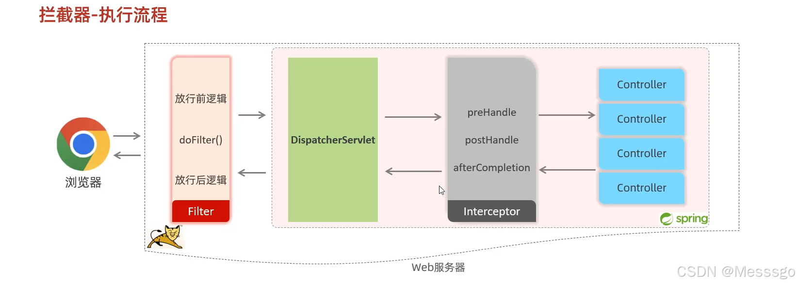 接口规范不同,过滤器通过Filter实现接口,拦截器通过HandlerInterceptor接口