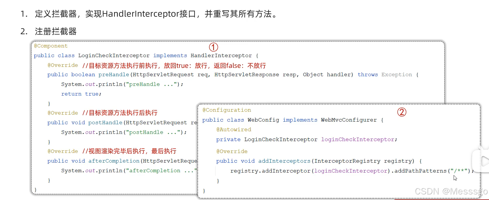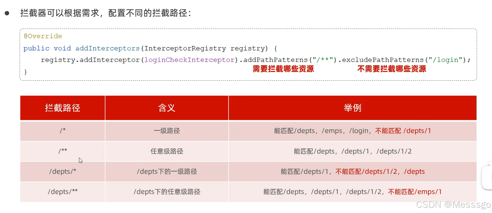 registry.addInterceptor(loginCheckInterceptor).addPathPatterns("/**");//添加拦截器,拦截所有资源;.excludePathPatterns()不需要拦截的资源