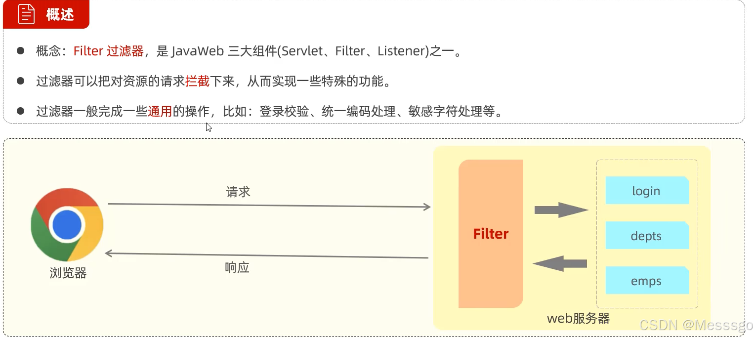 @WebFilter(urlPatterns = "/*")//配置过滤器,拦截所有请求
