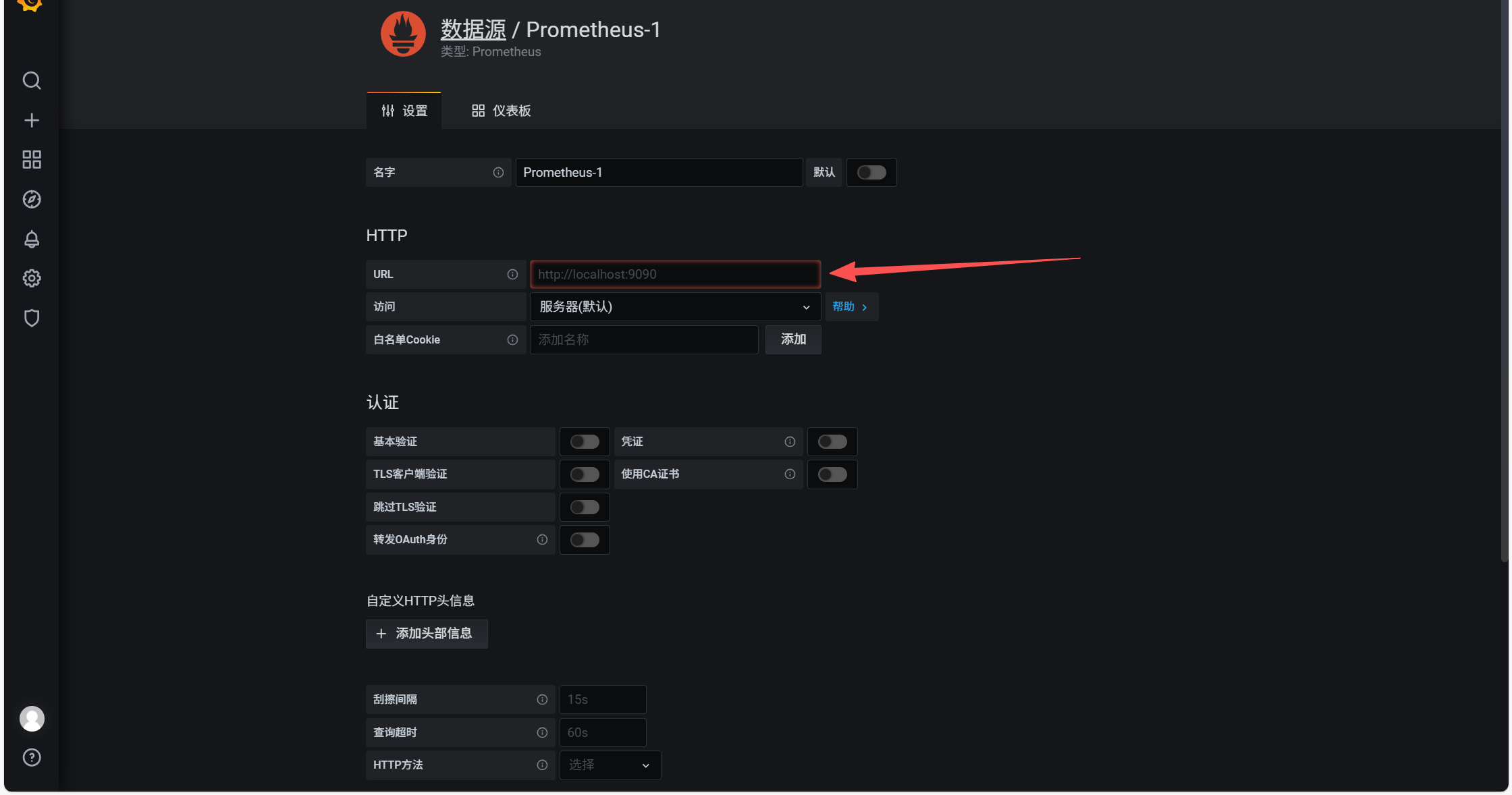 url选择你Prometheus的url地址,然后最下方有保存测试按钮,绿色就没问题。