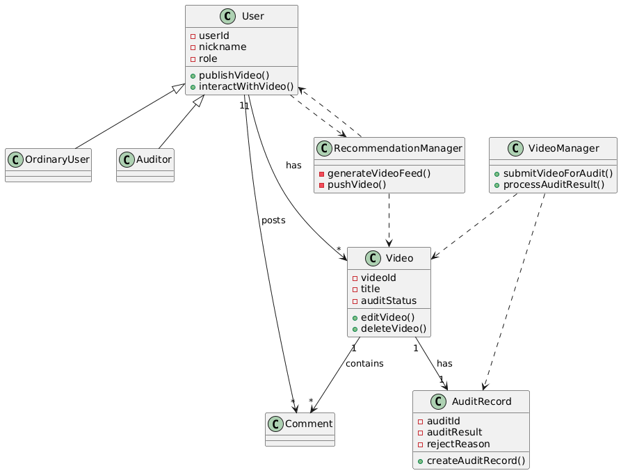 // 继承关系 OrdinaryUser -|> User Auditor -|> User // 关联关系 User "1" -- "*" Video (一对多:用户-视频) User "1" -- "*" Comment (一对多:用户-评论) Video "1" -- "*" Comment (一对多:视频-评论) Video "1" -- "1" AuditRecord (一对一:视频-审核记录) // 依赖关系 VideoManager ..> Video VideoManager ..> AuditRecord RecommendationManager ..> Video RecommendationManager ..> User User ..> RecommendationManager // 核心类属性(简化) User: userId, nickname, role; publishVideo(), interactWithVideo() Video: videoId, title, auditStatus; editVideo(), deleteVideo() AuditRecord: auditId, auditResult, rejectReason; createAuditRecord() VideoManager: submitVideoForAudit(), processAuditResult() RecommendationManager: generateVideoFeed(), pushVideo()