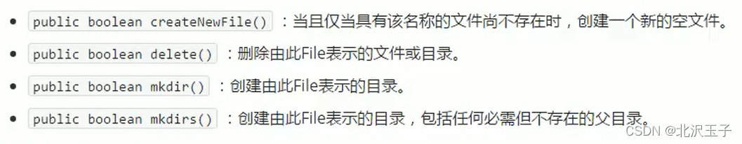 public boolean creatNewFile() throws IOException :创建文件的路径必须存在,否则会抛出异常,因此调用这个方法时,必须处理这个异常,要么throws,要么try catch