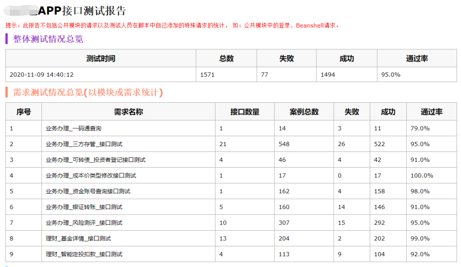 批量自动运行与定制报告:ANT生成的测试报告,是以请求为单位进行统计的,即一个请求一条统计记录,不能很好反应一个接口或一个需求下的案例执行情况,所以我们进行了二次开发,对ANT生成的测试报告通过Python进行二次解析,从整体测试情况、单需求测试情况、单接口测试情况三个维度进行统计,并生成测试报告,二次解析后的报告,能够更加直观、清晰的了解项目的整体测试情况,二次解析报告如下图: