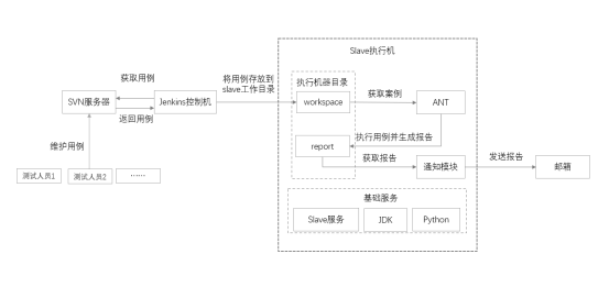 由于当时团队是采用持续集成jenkins进行代码的发布与运行,为实现持续集成、批量运行、定时报告输出。因此我们使用了SVN+JMeter+ANT+Jenkins框架来实现接口自动化。Jenkins控制机先从SVN服务器上获取JMeter脚本和测试数据,将脚本和数据拉取到Slave执行机上,并向执行机发送指令,调用ANT执行案例,ANT执行完案例,将.jtl报告聚合成一个*.html报告,由于ANT聚合的报告没有满足我们的个性化的需求,所以我们通过Python脚本对ANT生成的*.html报告,进行了二次解析,解析完成后,我们调用邮件发送模块,将测试报告发送给相关人,整体流程如下图所示:
