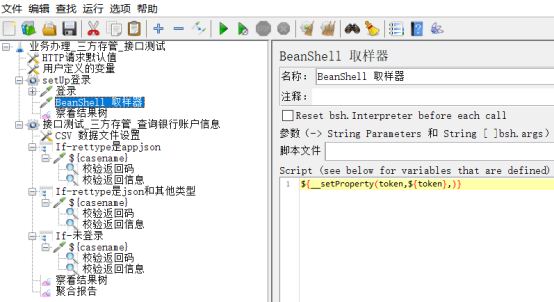 定制化开发函数: 在JMeter的函数助手中,已经有众多的函数支持接口案例编写,但是我们某些特定的场景,JMeter自带函数不能很好的满足我们的需求,需要我们定制开发函数,比如券商的银证转账业务,该业务只有在指定时间段,才能转账成功,非交易时间就会提示”此时间段不能进行银证转账”,也就意味着不同时间段执行银证转账的案例,其返回结果是不同的,为了案例能够在任何时间段都可以正确的执行,我们需要通过判断当前时间是否为交易时间来进行分别断言,此时我们就需要开发一个判断当前时间是否可以进行银证转账的函数,并将其封装成jar包并导入JMeter中,进行调用,在JMeter中我们通过使用自己定制函数来进行复杂的业务处理,以满足不同场景下的业务需求,由测试开发人员对复杂的业务逻辑进行封装,如下图所示,测试人员只需在JMeter的BeanShell元件中调用即可。
