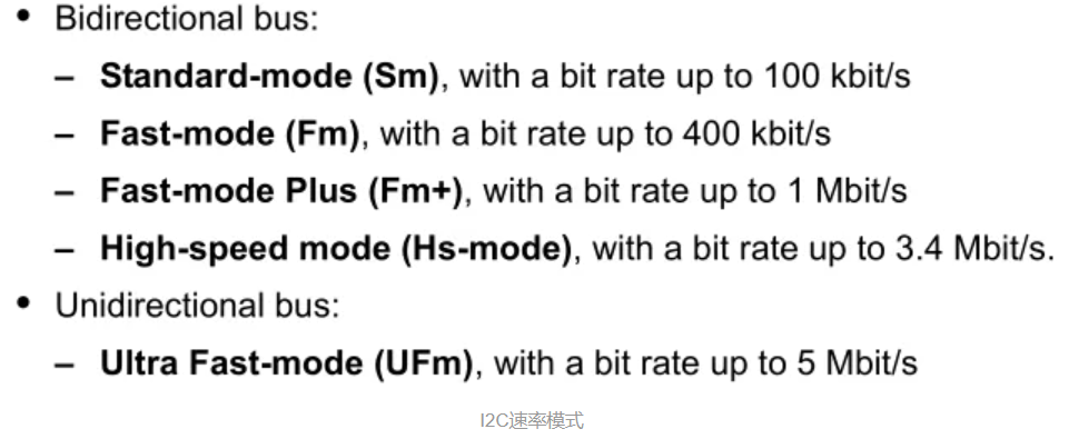 I2C协议可以工作在以下5种速率模式下,不同的器件可能支持不同的速率。
