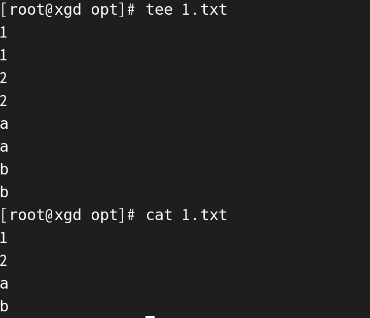 将标准输入复制到每个指定文件,并显示到标准输出。它可以将标准输入标准输出到屏幕上的同时将标准输出重定向到文件中