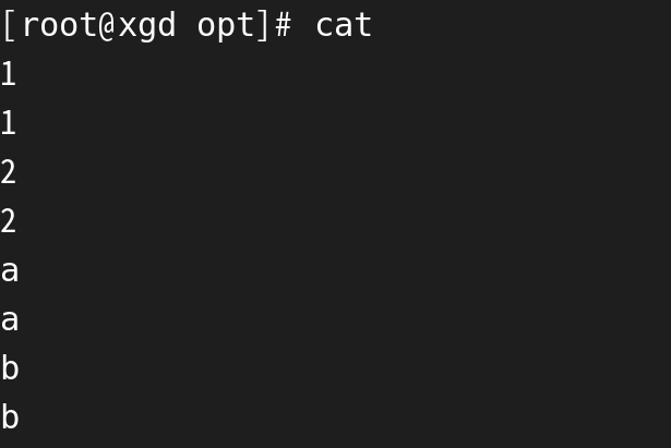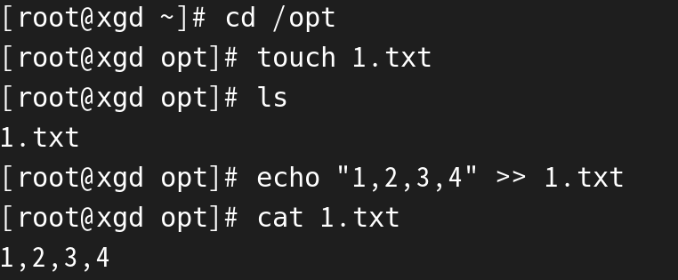 首先我在/opt下创建了文件1.txt,并往1.txt中写了“1,2,3,4” 4个数字。