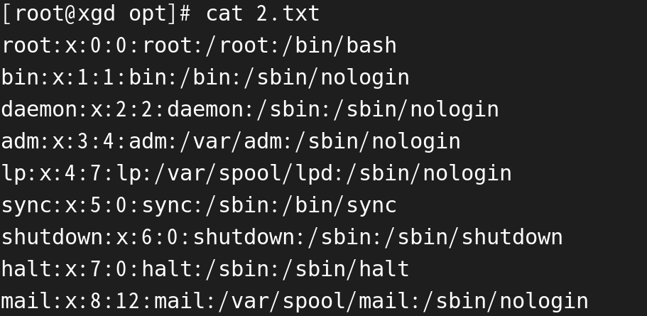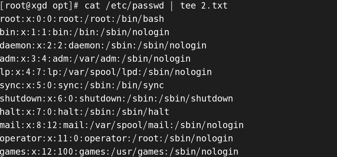 今天就举一个例子,就比如下面的命令,正常是查看/etc/passwd的内容并输入,我们加入了管道符,将左边命令输出的内容作为右边的输入把/etc/passwd的内容通过tee重定向到文件2.txt中去