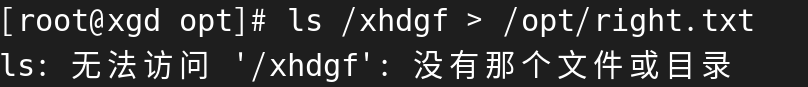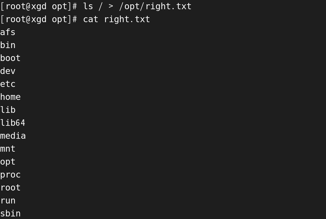 假设我们将ls /输出的数据放到文件right.txt中,此时ls /输出的内容并不会出现在屏幕上,而是被我们转移到文件right.txt中去了,如果转移的文件不存在,系统会自动给你创建一个。