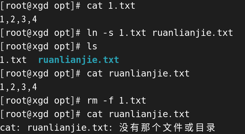 我们给文件1.txt创建了一个硬链接文件2.txt,硬链接文件有一个特点,它与源文件共享同一个inode节点编号,所以硬链接也可以通过inode节点编号访问到文件1.txt的真实数据,删除源文件1.txt后也不会影响硬链接文件正常访问源文件的真实数据。