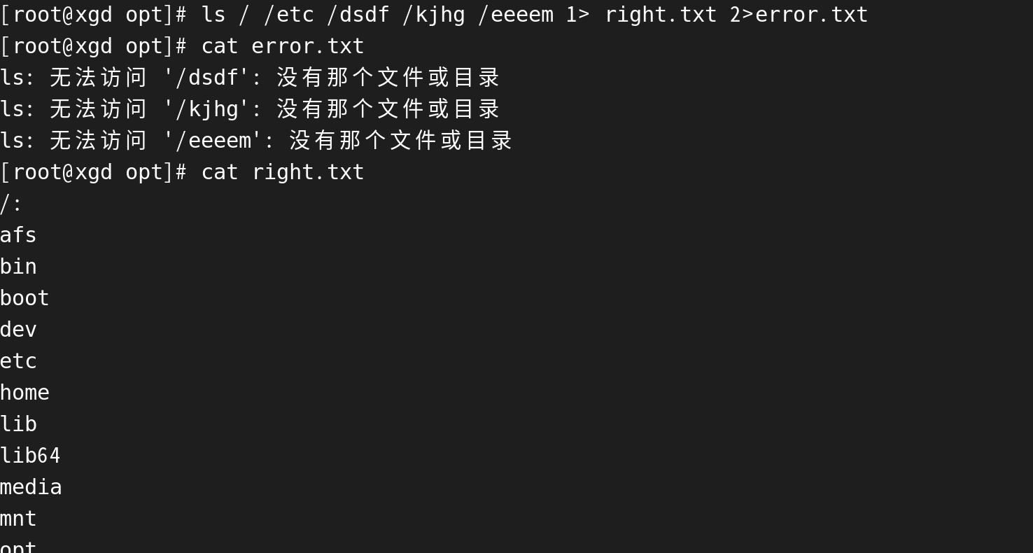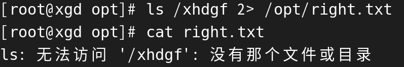 根据这个方法我们可以进行更复杂的操作,例如:ls / /etc /dsdf /kjhg /eeeem将这个命令中的标准输出放到文件right.txt中,将标准错误输出放到文件error.txt中。