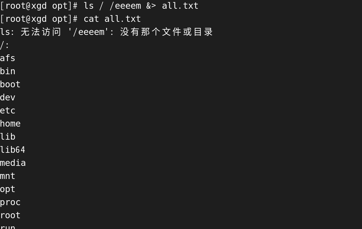 那如何将标准输出和标准错误输出一起放进一个文件all.txt中呢?我们可以进行以下操作