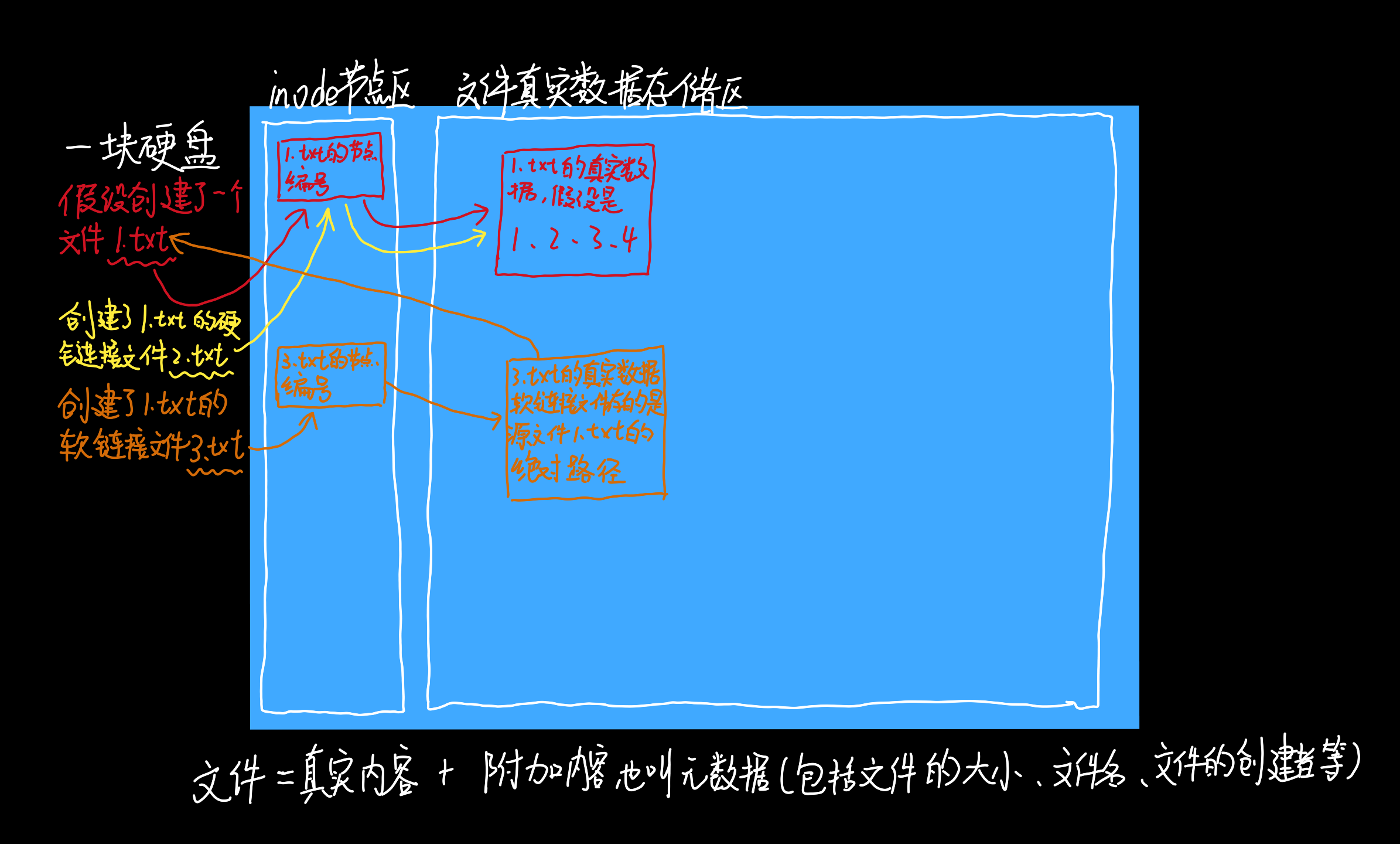首先我们应知道文件在硬盘中是如何存储的,硬盘不能直接存储文件,所以我们需要给他一个文件系统。文件系统实际上就是告诉硬盘如何存文件。如果没有文件系统那么文件会随意存入磁盘,导致想要查找一个文件非常困难。文件系统会将磁盘分成多个区域,分别为inode节点区和文件真实存储区。下面我们通过一张图片来了解软硬连接。