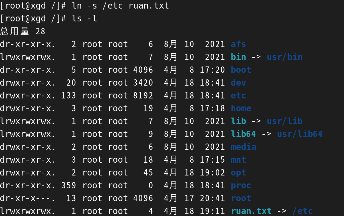 软连接文件的创建方式为:ln -s 源文件 目标文件