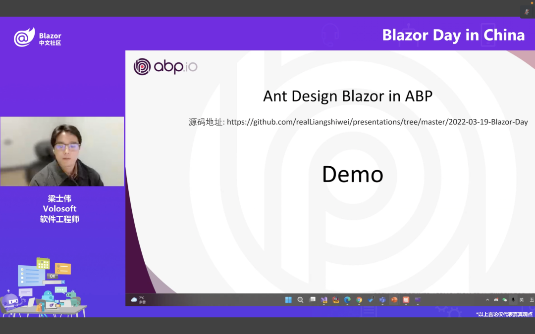 答 项目地址 https://github.com/realLiangshiwei/presentations/tree/master/2022-03-19-Blazor-Day, 微信公众号是 abp framework。