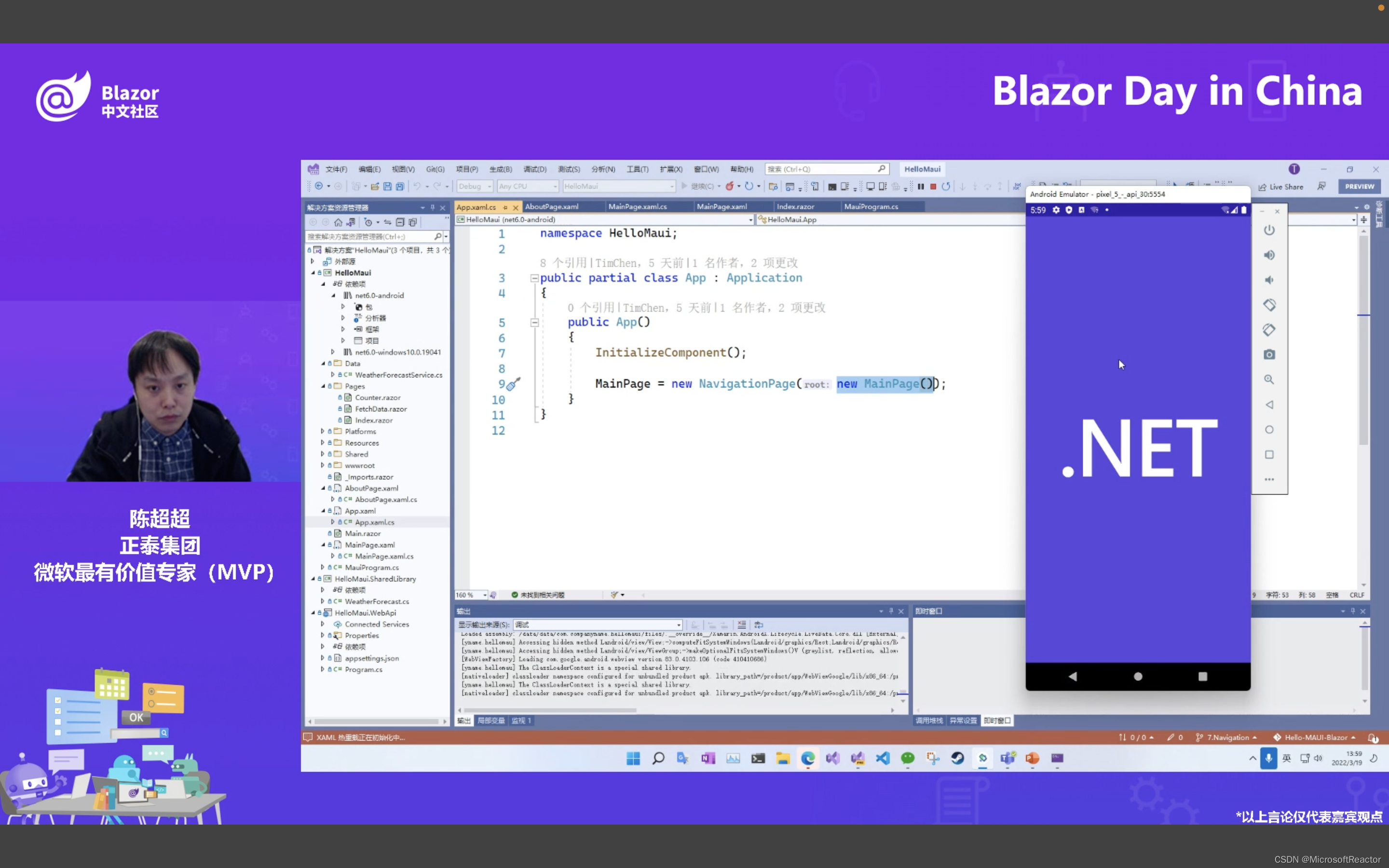 来自正泰集团,同时也是微软 MVP 的陈超超首先为我们带来 MAUI Blazor 的话题。他为我们介绍了 MAUI Blazor 可以帮助我们解决哪些问题,MAUI 是如何工作的,并在线 coding,用现有项目存在的需求,采用 MAUI 做了演示。由于网络配置原因,演示的最后出现了一点小问题,超超老师也在结束之后找到了原因,并进行了运行和调试演示。