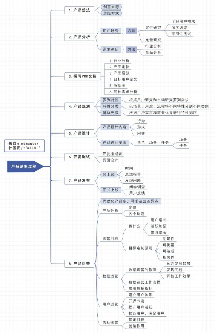 产品诞生一共有8个环节,它们分别是【产品想法---产品分析---撰写PRD文档---产品规划---产品设计---开发测试---产品发布---产品运营】