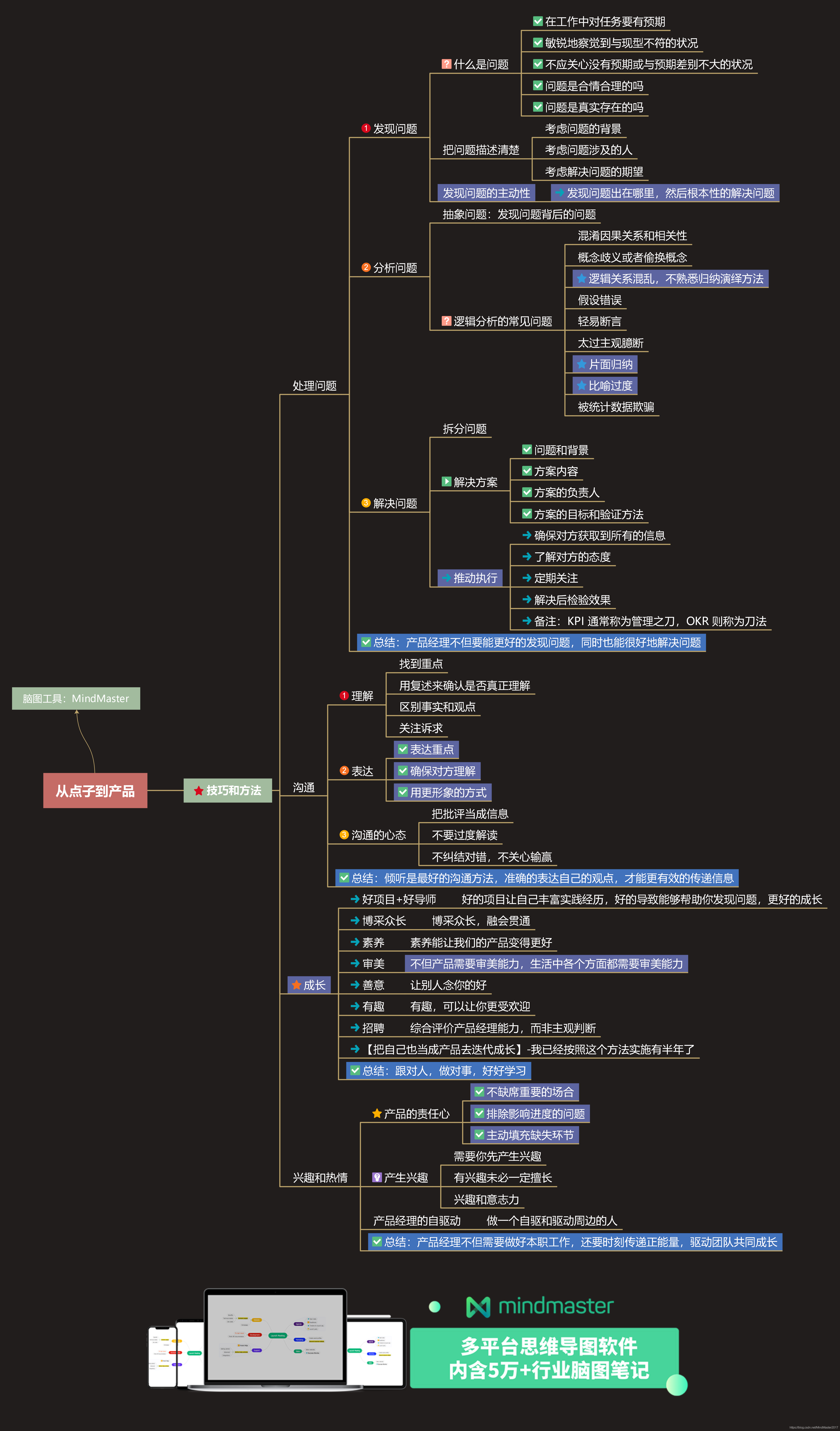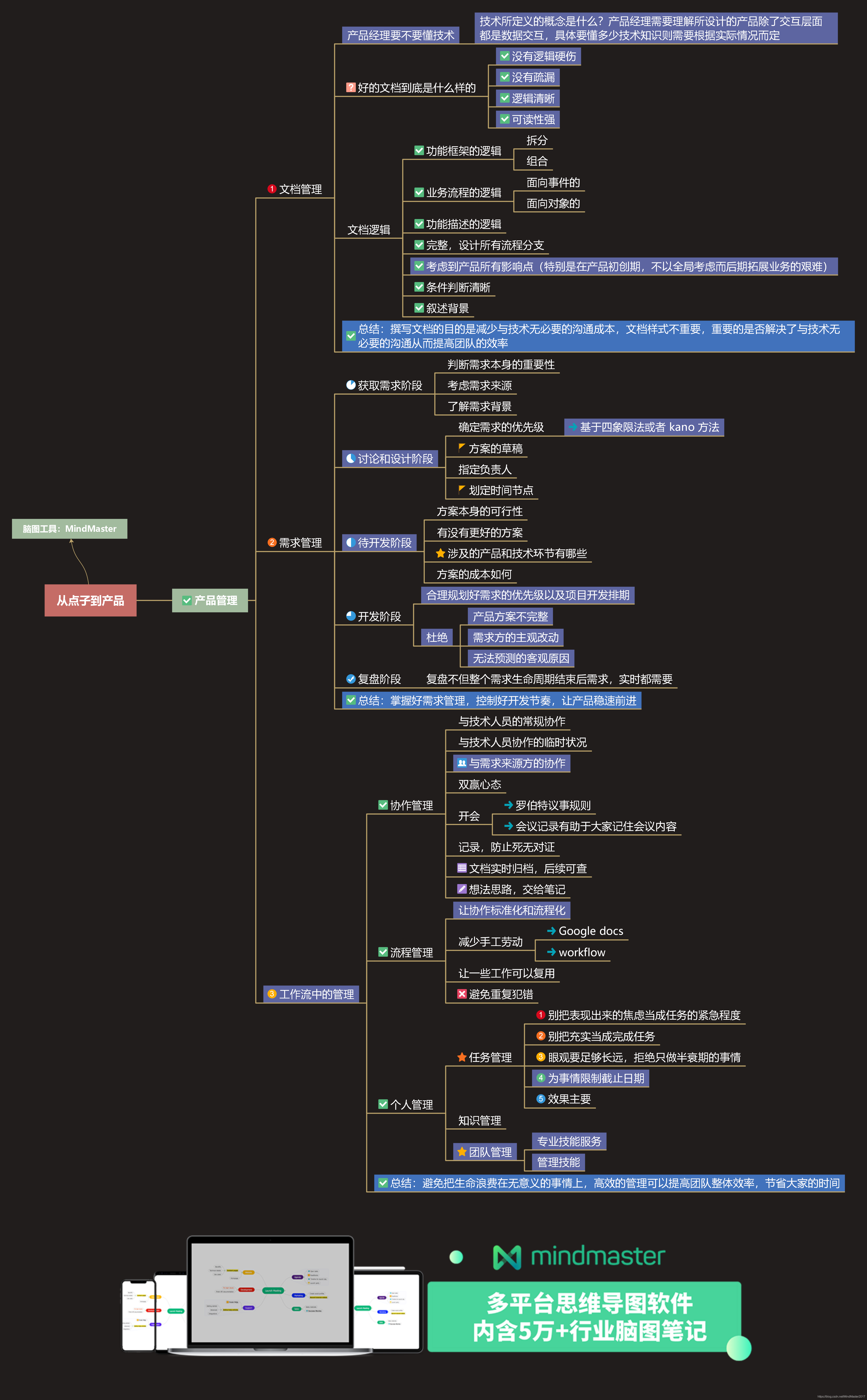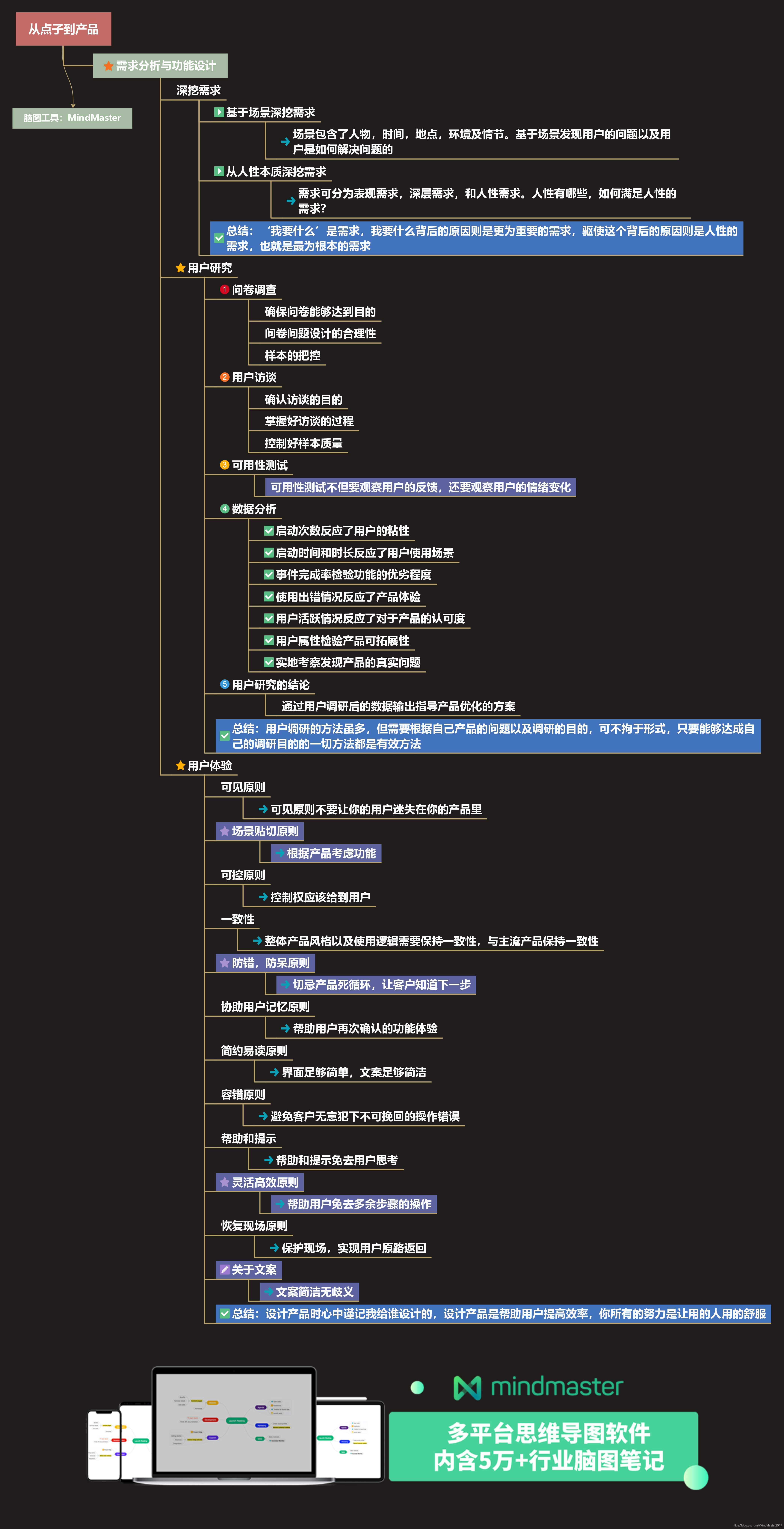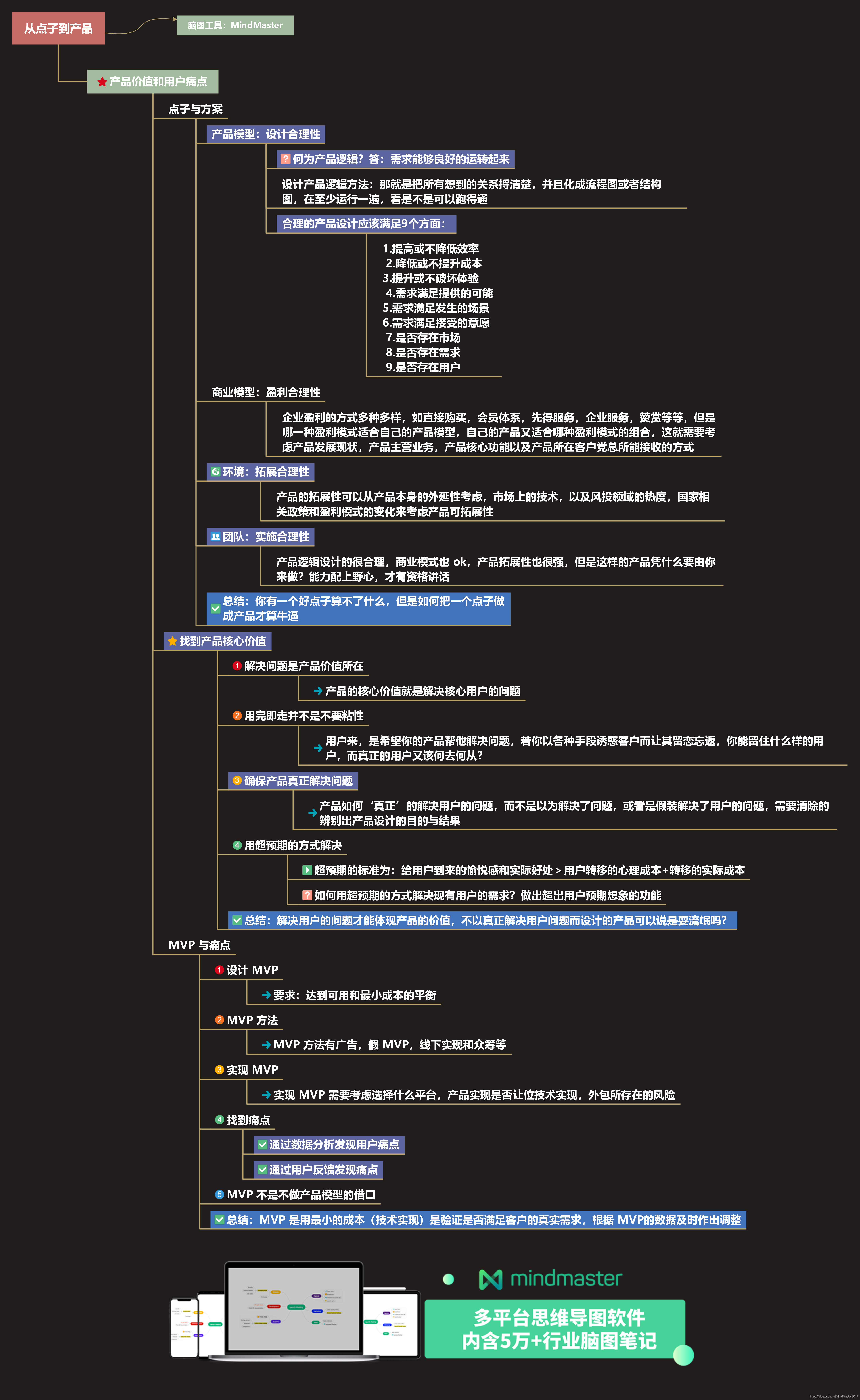 导图分别为产品管理、需求分析与功能设计、产品价值和用户痛点、技巧和方法一步步将创意运用于实际中。