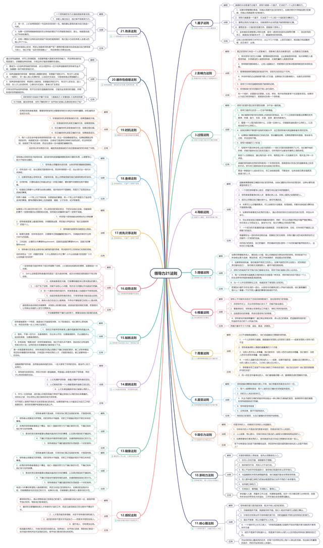 本书总结了21条领导力法则,包括盖子法则、影响力法则等,每条法则均提供了具体的应用建议,旨在帮助读者提升领导力。