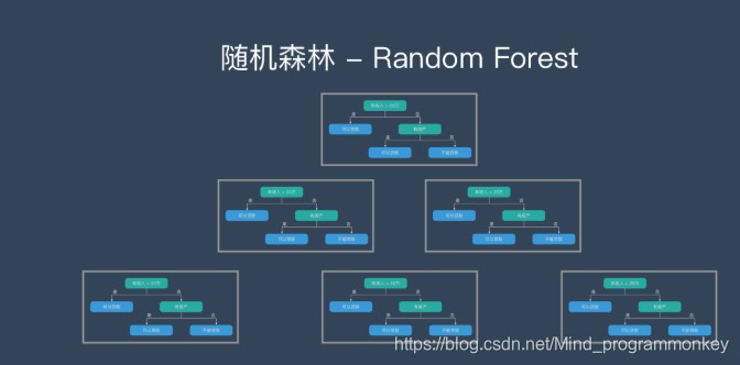 当我们进行分类任务时,新的输入样本进入,就让森林中的每一棵决策树分别进行判断和分类,每个决策树会得到一个自己的分类结果,决策树的分类结果中哪一个分类最多,那么随机森林就会把这个结果当做最终的结果。