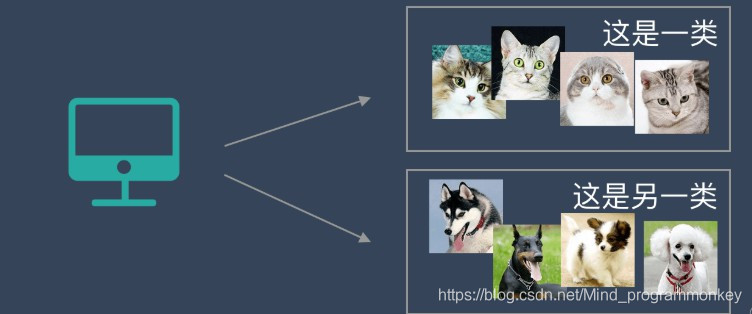我们把一堆猫和狗的照片给机器,不给这些照片打任何标签,但是我们希望机器能够将这些照片分分类。
