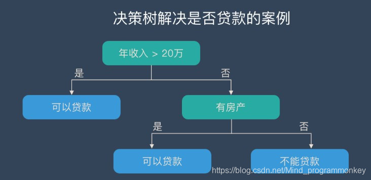 首先判断客户的年收入指标。如果大于20万,可以贷款;否则继续判断。然后判断客户是否有房产。如果有房产,可以贷款;否则不能贷款。