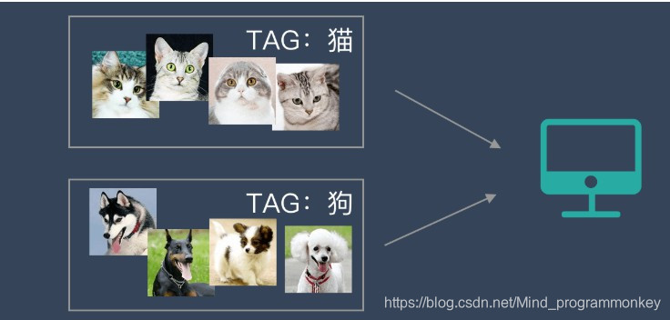 我们准备了一大堆猫和狗的照片,我们想让机器学会如何识别猫和狗。当我们使用监督学习的时候,我们需要给这些照片打上标签。