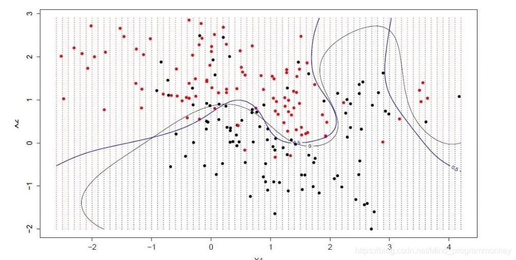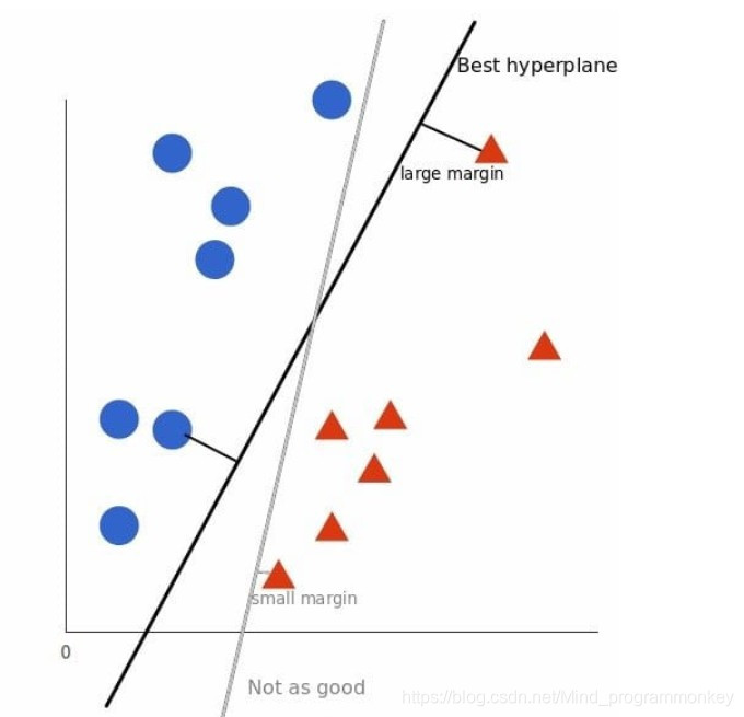 支持向量机会接受这些数据点,并输出一个超平面(在二维的图中,就是一条线)以将两类分割开来。这条线就是判定边界:将红色和蓝色分割开。