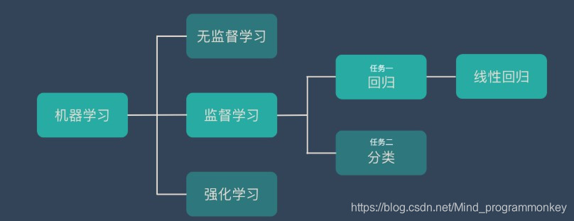 线性回归的位置如上图所示,它属于机器学习 – 监督学习 – 回归 – 线性回归。