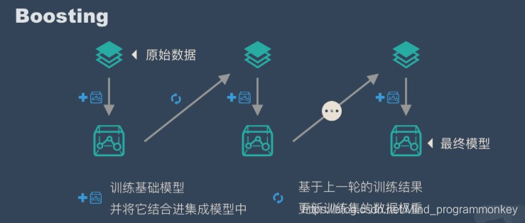 - Boosting:每一轮的训练集不变,只是训练集中每个样例在分类器中的权重发生变化。而权值是根据上一轮的分类结果进行调整。