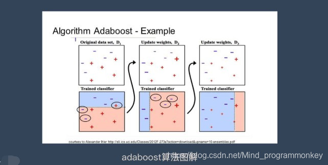 - c.在每一轮改变训练数据的权值或概率分布,通过提高那些在前一轮被弱分类器分错样例的权值,减小前一轮分对样例的权值,来使得分类器对误分的数据有较好的效果。