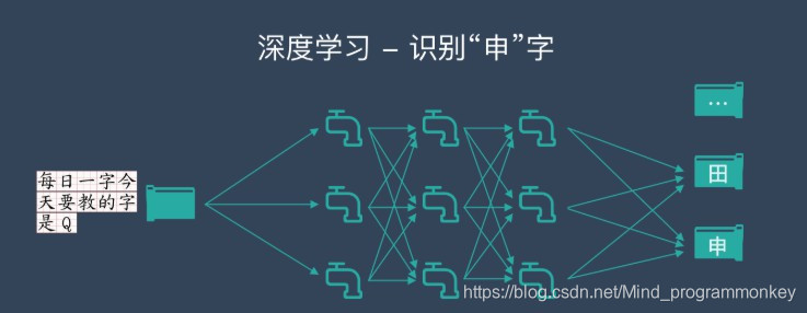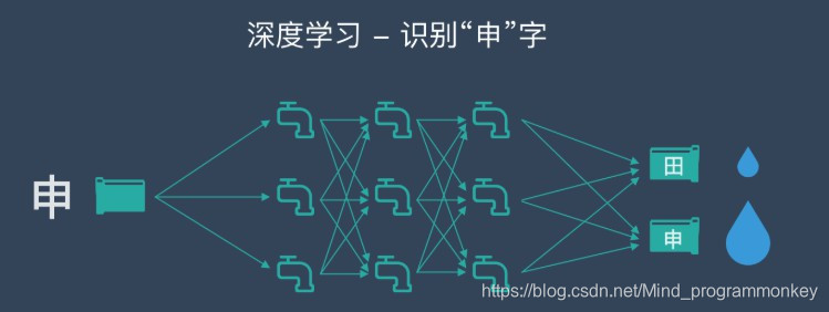 下一步,学习“申”字时,我们就用类似的方法,把每一张写有“申”字的图片变成一大堆数字组成的水流,灌进水管网络,看一看,是不是写有“申”字的那个管道出口流水最多,如果不是,我们还得再调整所有的阀门。这一次,要既保证刚才学过的“田”字不受影响,也要保证新的“申”字可以被正确处理。