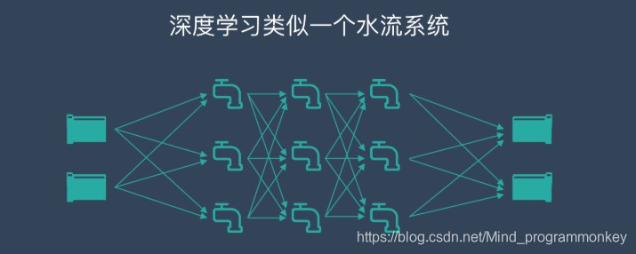 假设深度学习要处理的信息是“水流”,而处理数据的深度学习网络是一个由管道和阀门组成的巨大水管网络。网络的入口是若干管道开口,网络的出口也是若干管道开口。这个水管网络有许多层,每一层由许多个可以控制水流流向与流量的调节阀。根据不同任务的需要,水管网络的层数、每层的调节阀数量可以有不同的变化组合。对复杂任务来说,调节阀的总数可以成千上万甚至更多。水管网络中,每一层的每个调节阀都通过水管与下一层的所有调节阀连接起来,组成一个从前到后,逐层完全连通的水流系统。