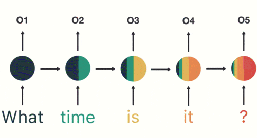 以此类推,前面所有的输入都对未来的输出产生了影响,大家可以看到圆形隐藏层中包含了前面所有的颜色。如下图所示: