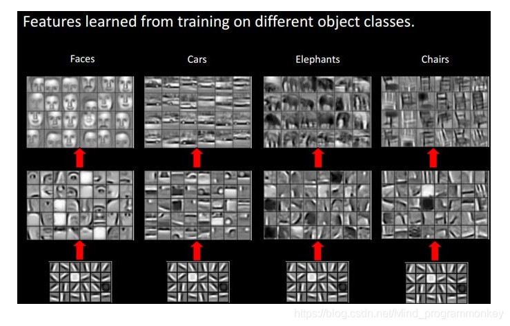 我们可以看到,在最底层特征基本上是类似的,就是各种边缘,越往上,越能提取出此类物体的一些特征(轮子、眼睛、躯干等),到最上层,不同的高级特征最终组合成相应的图像,从而能够让人类准确的区分不同的物体。