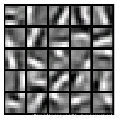 在具体应用中,往往有多个卷积核,可以认为,每个卷积核代表了一种图像模式,如果某个图像块与此卷积核卷积出的值大,则认为此图像块十分接近于此卷积核。如果我们设计了6个卷积核,可以理解:我们认为这个图像上有6种底层纹理模式,也就是我们用6中基础模式就能描绘出一副图像。以下就是25种不同的卷积核的示例: