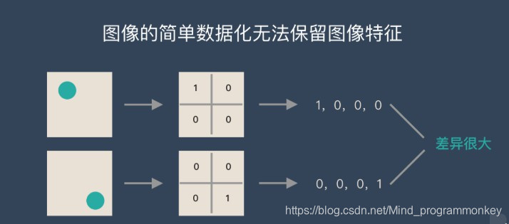 假如有圆形是1,没有圆形是0,那么圆形的位置不同就会产生完全不同的数据表达。但是从视觉的角度来看,图像的内容(本质)并没有发生变化,只是位置发生了变化。