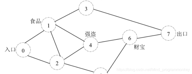 (3)洞穴探宝问题:有一幅藏宝图,设计一个算法要求从入口到出口,并且必须经过“食品”和“财宝”的地方,不得经过“强盗”的地方。