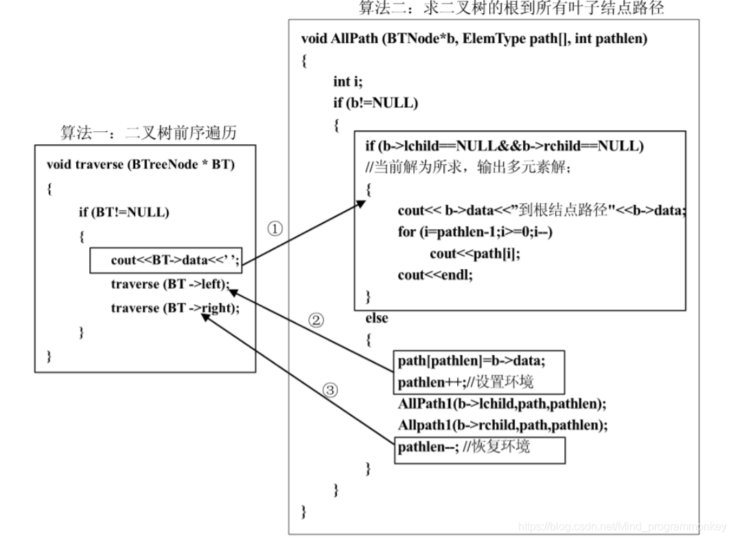 例:假设二叉树采用二叉链存储结构存储,试设计一个算法,输出从每个叶子结点到根结点的路径。