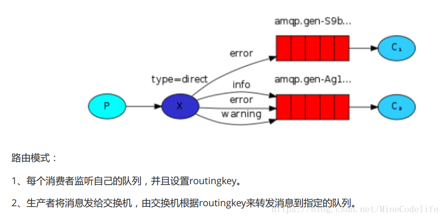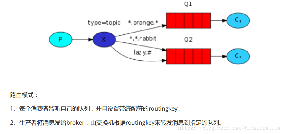 Routing模式要求队列在绑定交换机时要指定routingkey,消息会转发到符合routingkey的队列