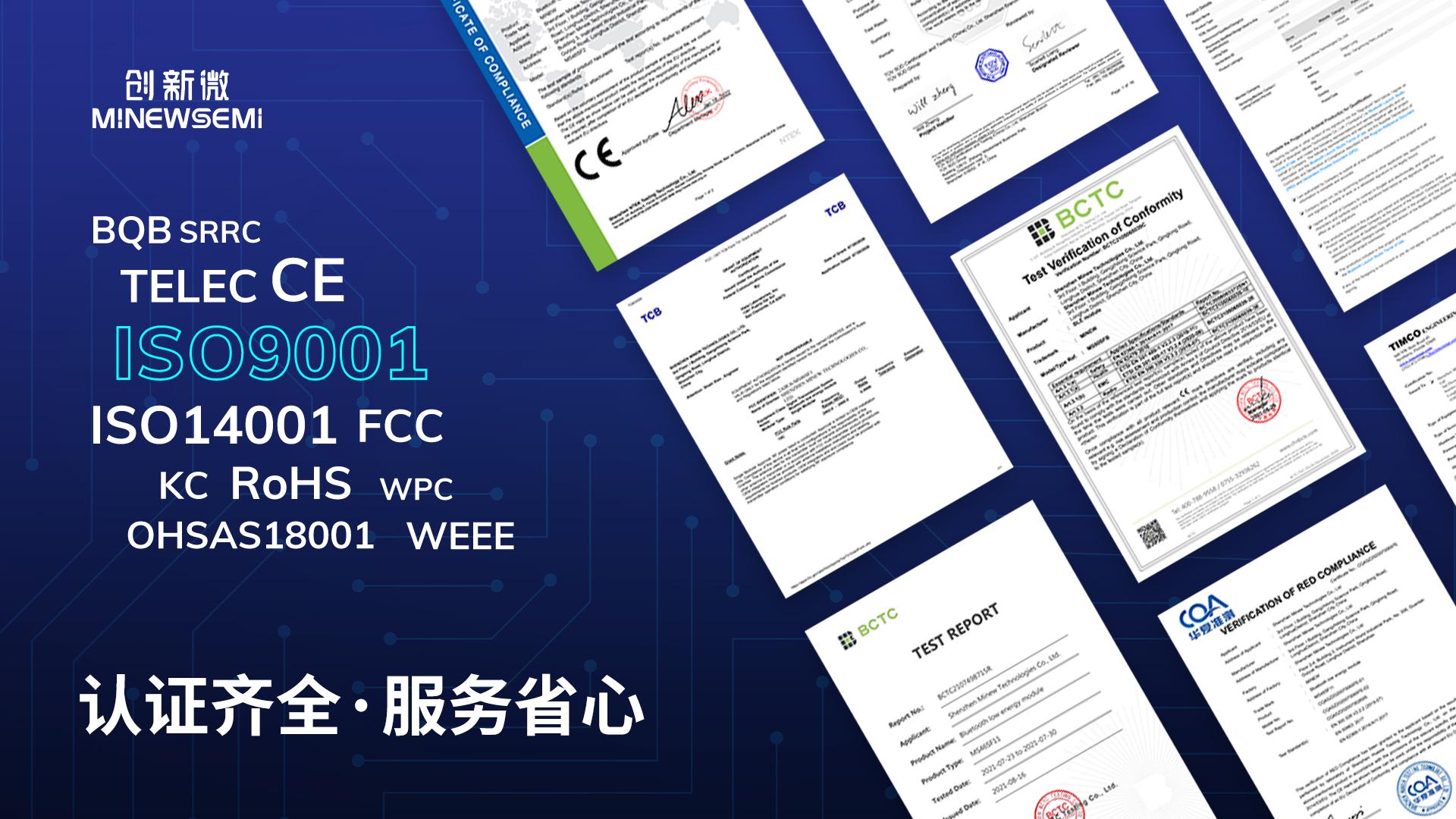 创新微MinewSemi通过多重行业资格认证和产品认证,目前创新微MinewSemi生产的物联网连接模块已经通过CE、RoHS、BQB、WEEE、TELEC、WPC、KC、SRRC 等全品类的认证,始终为客户提供专业、标准、规范的产品和服务。
