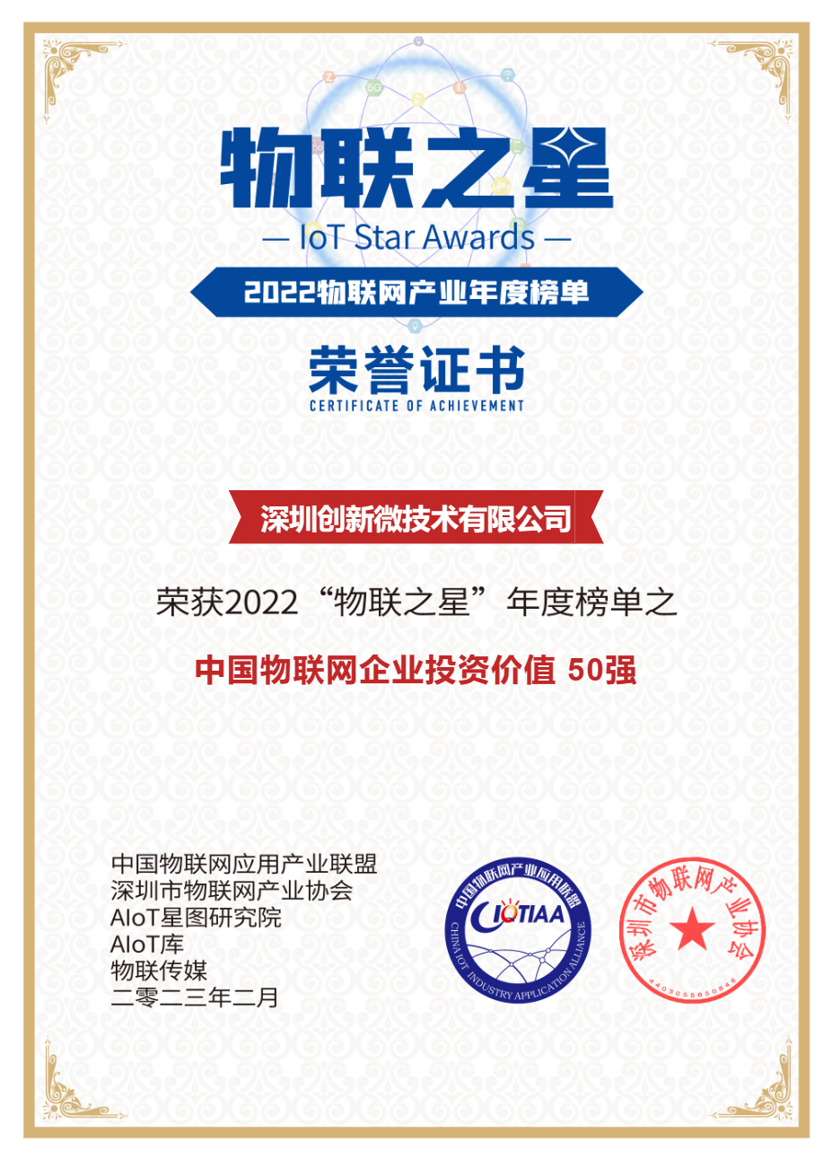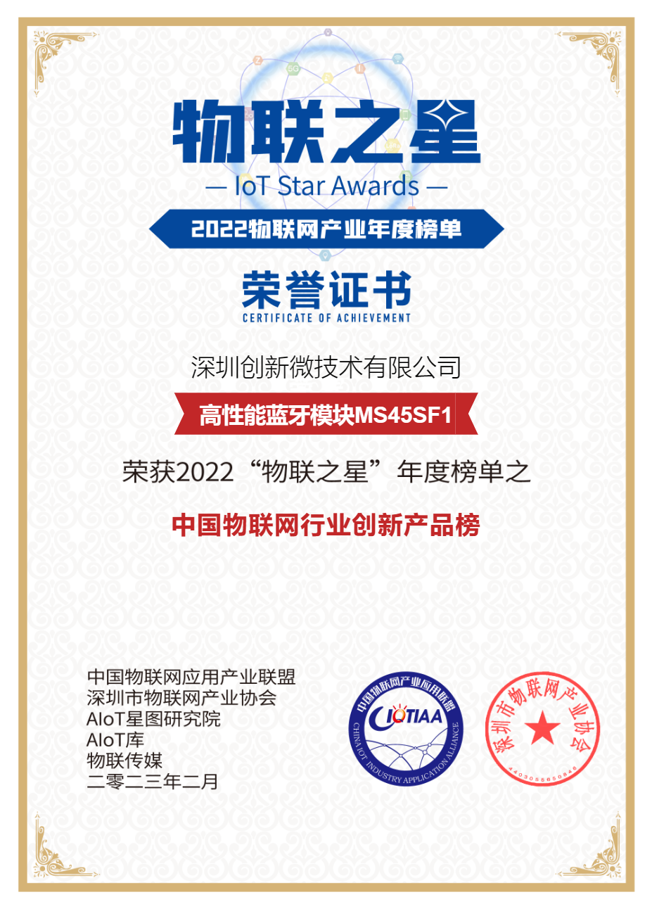 春风送暖,喜讯连连!2023年2月7日,“2022物联之星”中国物联网产业年度榜单评选结果正式公布。经过层层评选,深圳创新微技术有限公司有幸在本届物联之星大奖中,荣获2022“物联之星”年度榜单之中国物联网企业投资价值50强,并凭借高性能蓝牙模块MS45SF1荣获2022“物联之星”年度榜单之中国物联网行业创新产品榜。