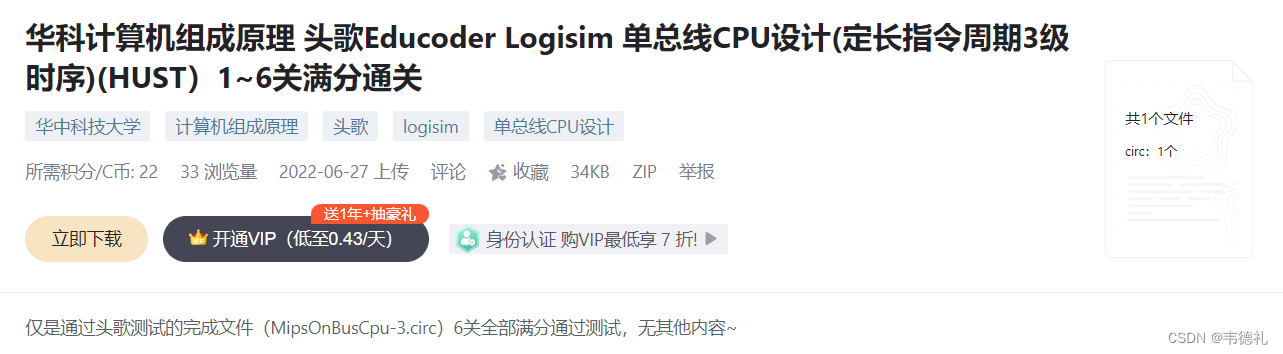 下载链接:单总线CPU设计(定长指令周期3级时序)(HUST)1~6关满分通关