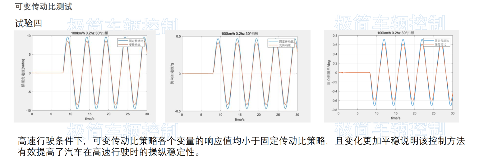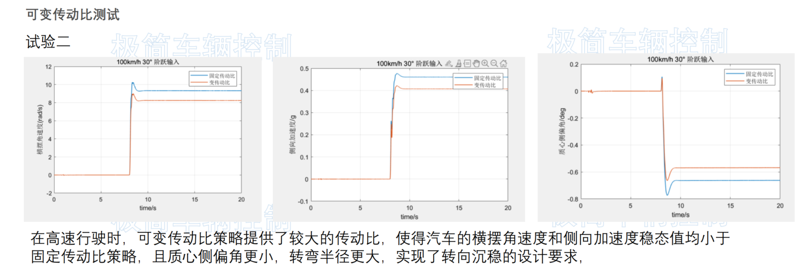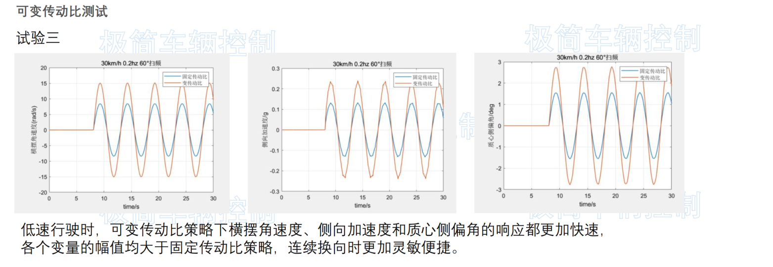 车辆在低速时,给小传动比,同样的方向盘转角下,输出较大车轮转角,实现低速转向灵活,转向半径小的特点。车辆在高速时,输出大传动比,同样的方向盘转角下,输出较小车轮转角,实现高速转向沉稳的特点。